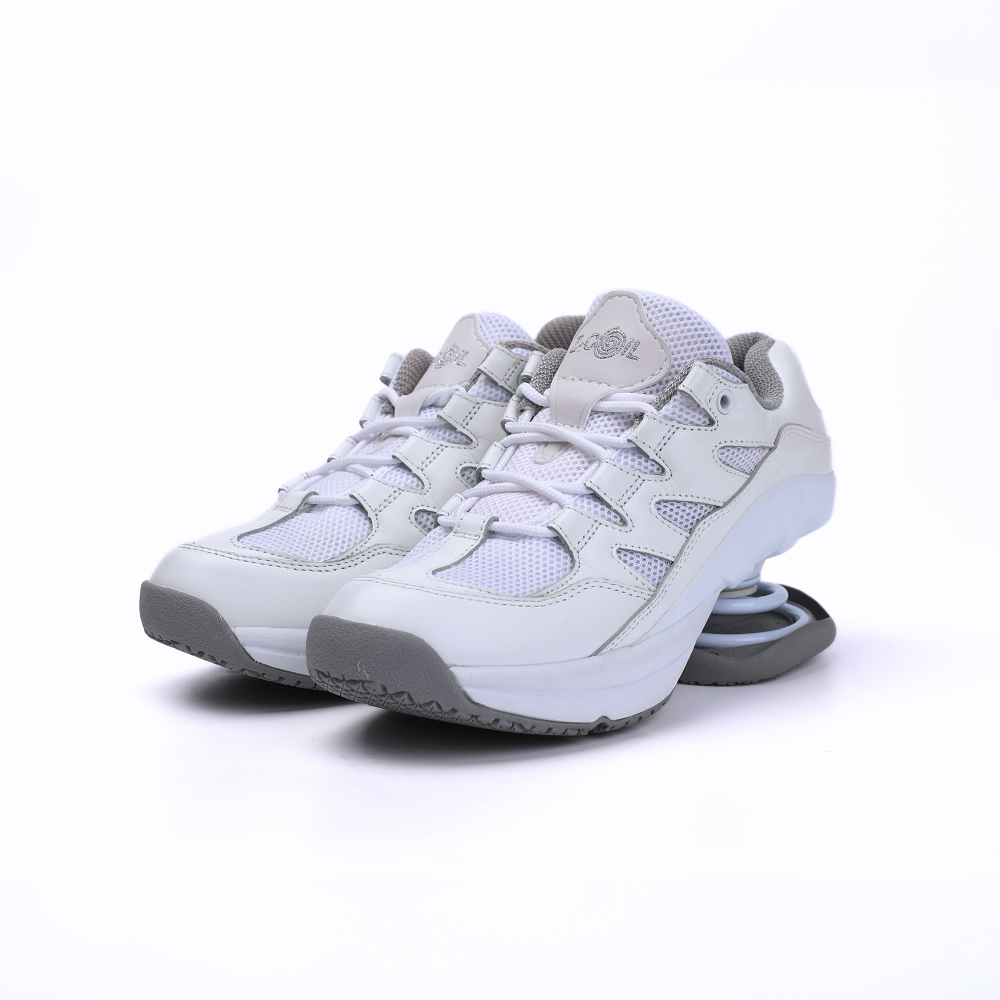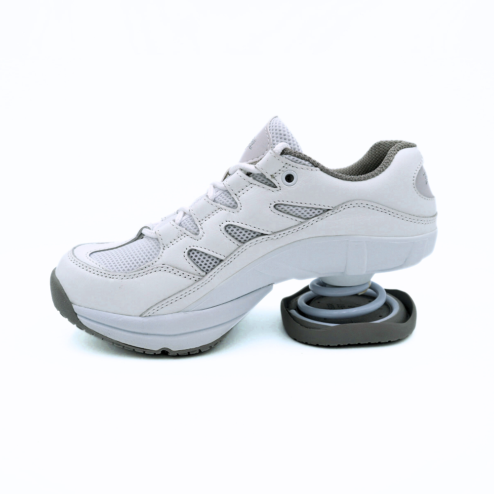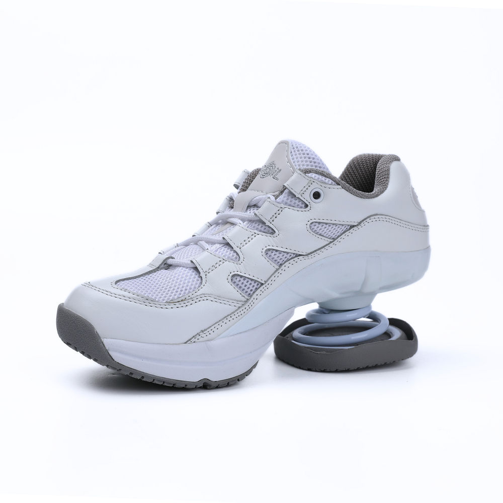Materials: Leather upper, rubber outsole, PVC midsole, steel coil heel. & Features: Shock-absorbing spring, non-slip sole, durable leather.