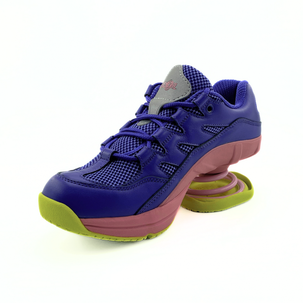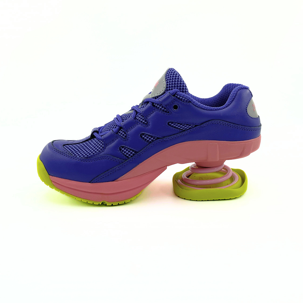 Materials: Leather upper, rubber outsole, PVC midsole, steel coil heel. & Features: Shock-absorbing spring, non-slip sole, durable leather.